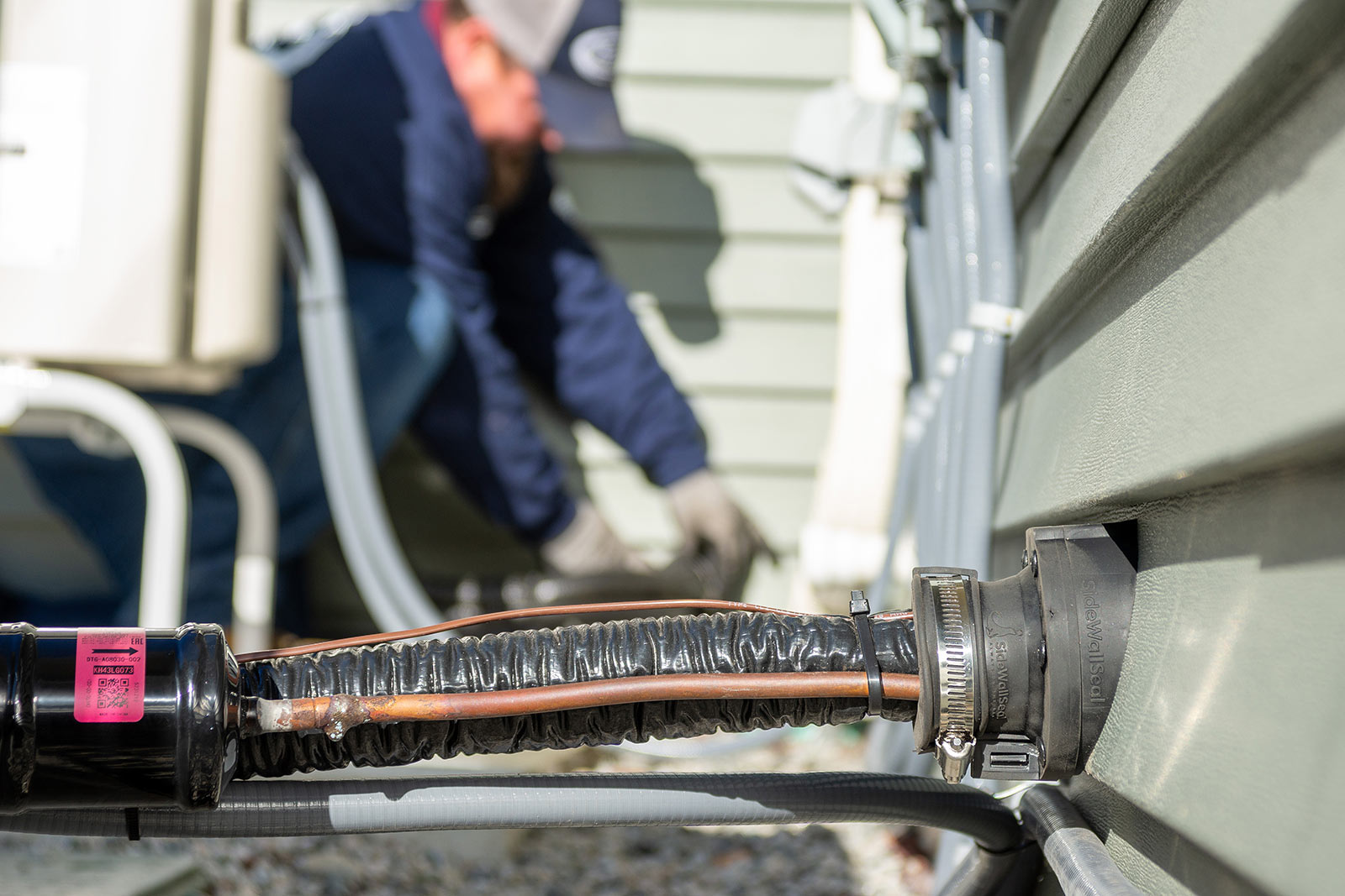 A cutaway of copper lines exiting sidewall seal's 2 3/8-inch side wall line set termination.